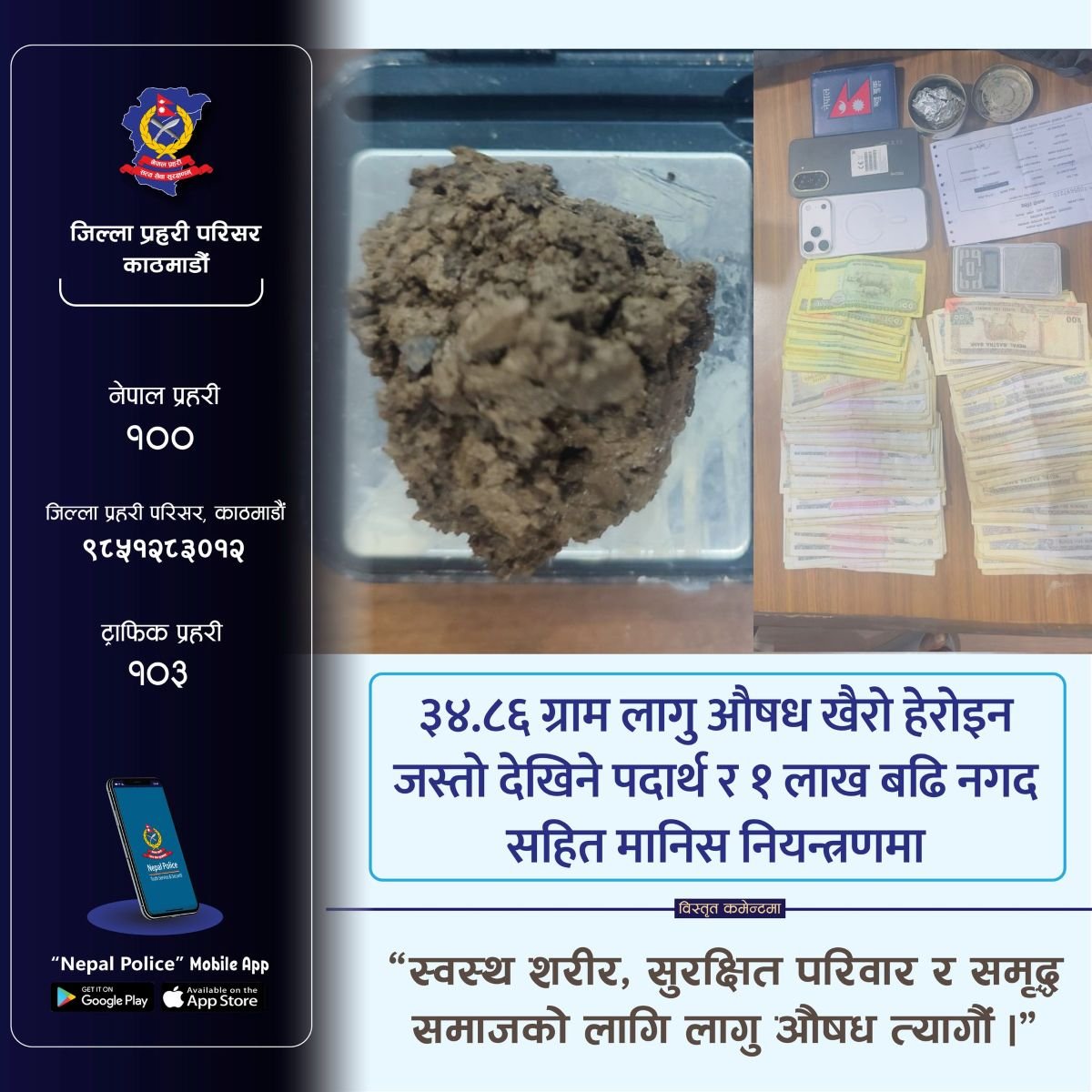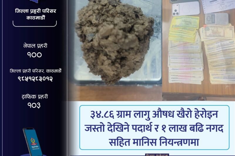 काठमाडौं । काठमाडौं महानगरपालिका–३२, संगमचोकस्थित एक होस्टेलमा लागूऔषध खरिद–बिक्री भइरहेको सूचनाका आधारमा प्रहरीले छापा मार्दा ३४.६८ ग्राम खैरो हेरोइन अर्थात् ‘ब्राउन सुगर’ जस्तो देखिने पदार्थ, १ लाख ५ हजार रुपैयाँ नगद र अन्य सामग्रीसहित एकजना … होस्टेलमा लागूऔषध छापा : १ लाख ५ हजार नगदसहित आशिष राय अमाद प क्रा उRead more