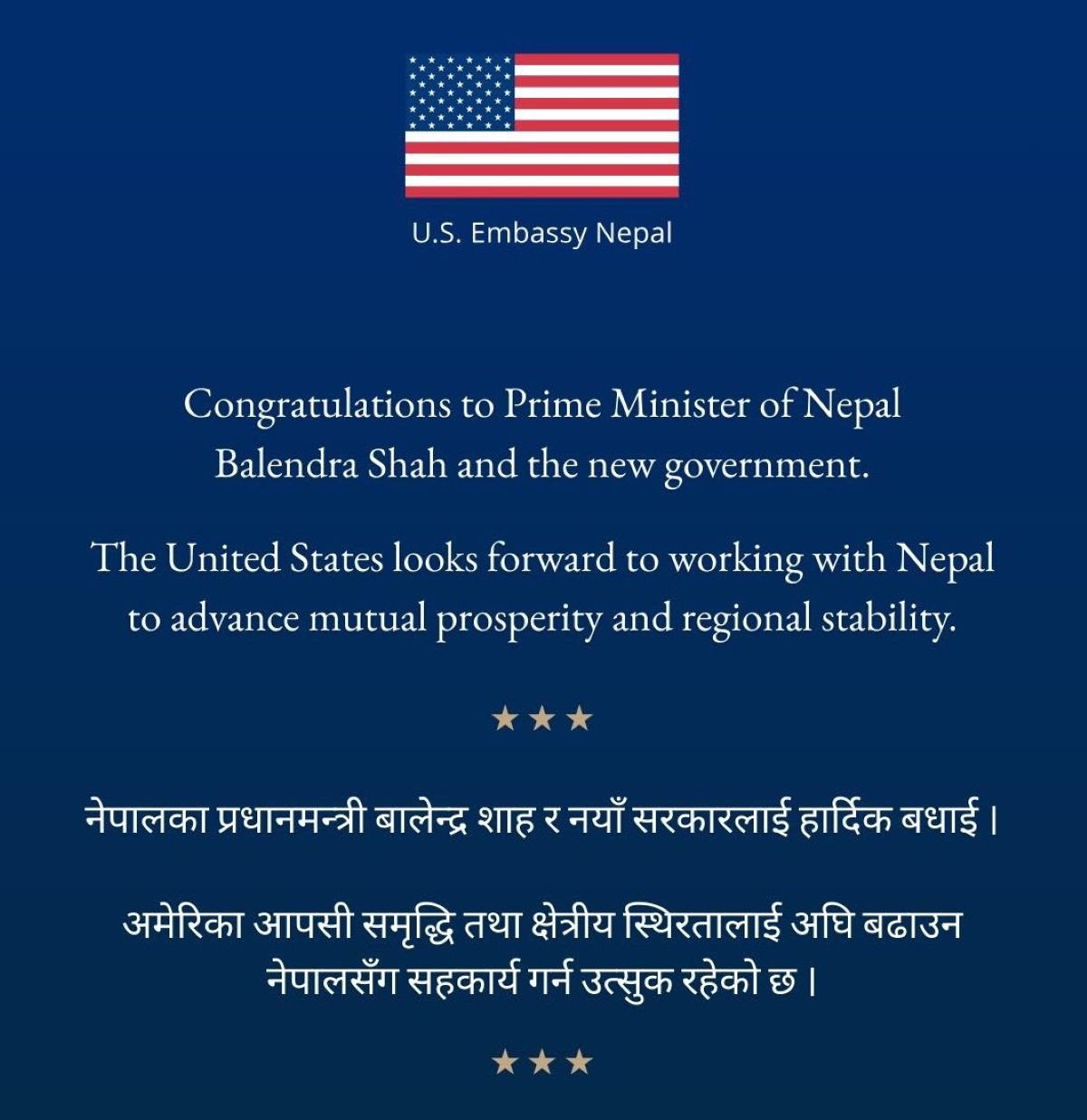 काठमाडौँ, १३ चैत्र : नवनियुक्त प्रधानमन्त्री बालेन्द्र शाहलाई संयुक्त राज्य अमेरिकाले बधाई दिएको छ ।