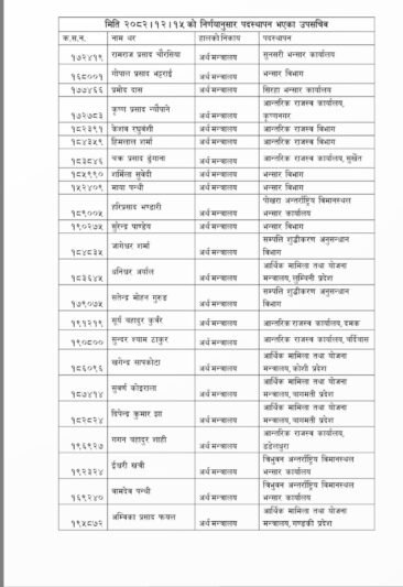 मेरिटअनुसार पहिलो हुनेले पहिले पोष्टिङ छान्ने, दोस्रोले बाँकी २९ मध्येको ठाउँ छान्ने, दोस्रो हुनेले बाँकी २९ ठाउँ मध्ये एक रोज्ने र मेरिटमा तेस्रो हुनेले बाँकी रहेको २८ बाट छान्ने विधिअनुसार यो बढुवापछिको पदस्थापन भएको मन्त्रालयले जनाएको छ ।