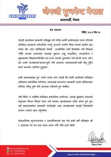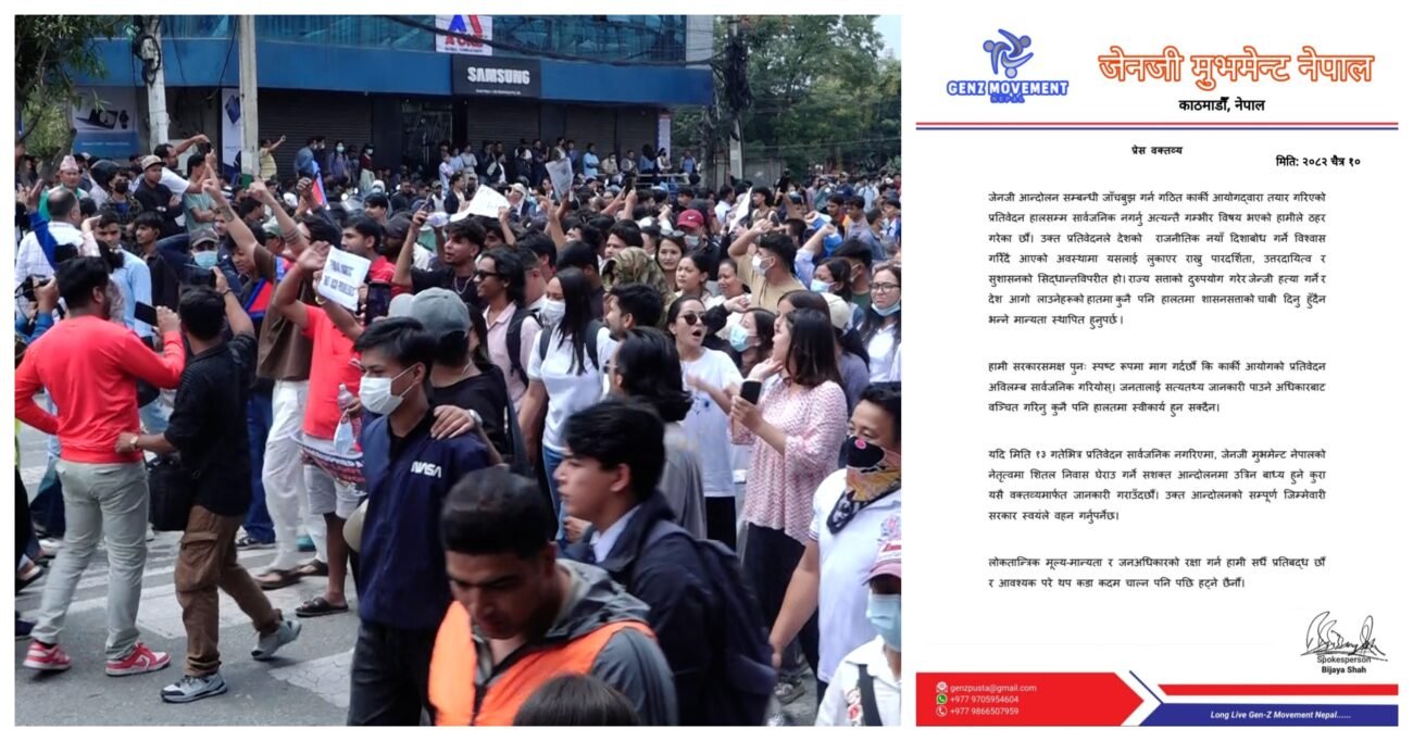 जेनजी मुभमेन्ट नेपालले सरकारलाई यही १३ गतेभित्र प्रतिवेदन सार्वजनिक गर्न अल्टिमेटम समेत दिएको छ । उक्त समयसीमाभित्र माग पूरा नभए शीतल निवास घेराउसहित सशक्त आन्दोलन गर्ने चेतावनी दिइएको छ । वक्तव्यमा आन्दोलनका क्रममा उत्पन्न हुने सम्पूर्ण परिस्थितिको जिम्मेवारी सरकार स्वयंले लिनुपर्ने उल्लेख गरिएको छ ।