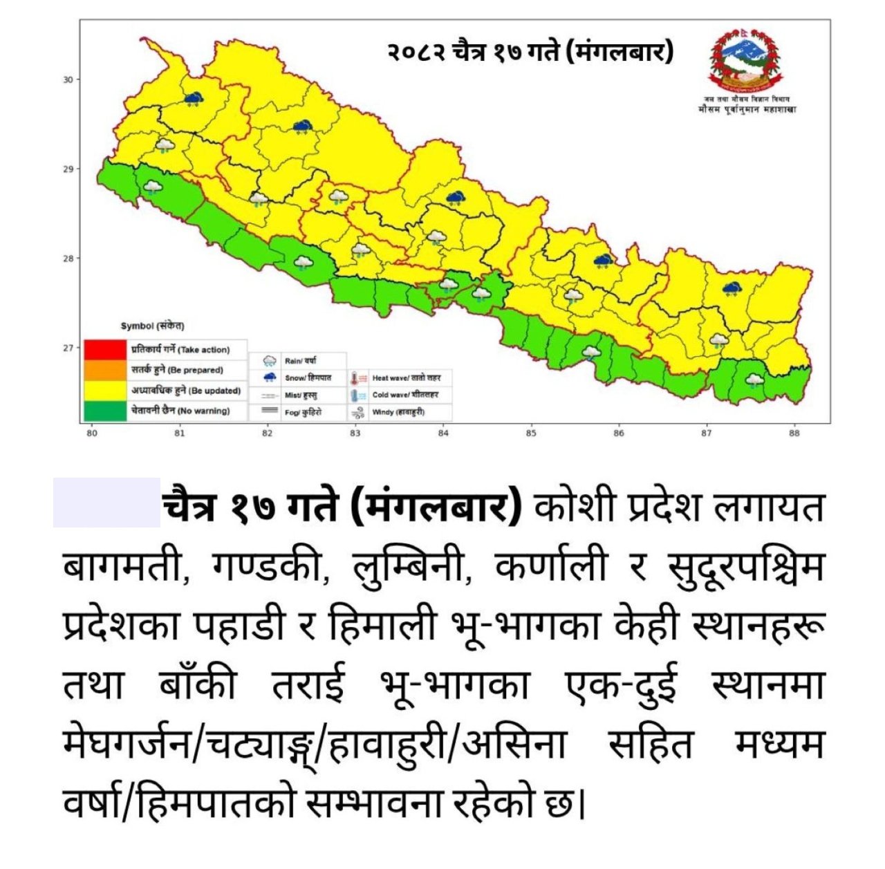 महाशाखाका अनुसार आज दिउँसो कोशी र मधेस प्रदेशलगायत देशका पहाडी र हिमाली भूभागमा साधारणतया बादल लाग्नेछ भने तराई भूभागमा आंशिक बादल लाग्नेछ । कोशी प्रदेशलगायत देशका पहाडी र हिमाली भूभागका केही स्थान तथा बाँकी भूभागका थोरै स्थानमा मेघगर्जन र चटयाङ, हुरीबतास र असिना सहित मध्यम वर्षा र हिमपातको सम्भावना छ ।