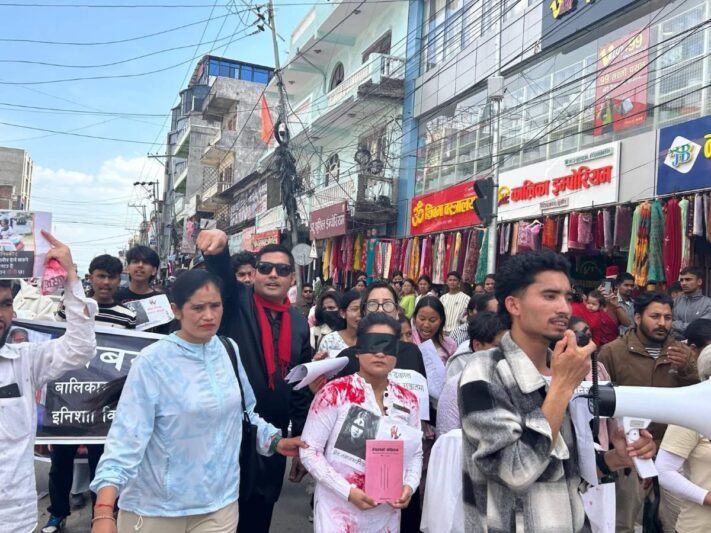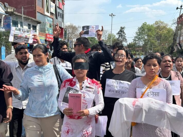 सुर्खेत । इनिशाको हत्या गरिएको र दोषीलाई कार्वाहीमा ढिला भएको भन्दै २०८२ चैत १४ गते शनिबार वीरेन्द्रनगरमा अधिकारकर्मी र अभियन्ताहरुले इनिशाको लासकाे डमी बोकेर प्रदर्शन गरेका छन् । महिला अधिकारकर्मी तथा सामाजिक अभियन्ता सावित्री सुवेदी र रञ्जना कामीसहितको उपस्थितिमा वीरेन्द्रनगरमा प्रदर्शन गरेका हुन् । उनीहरुले हातमा नेपालको संविधान समातेर आखामा कालोपट्टी बाँधेर इनिशाको न्यायको माग गरेका हुन् ।