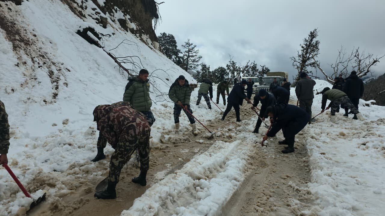 बागलुङ, २०८२ चैत ८ गते । भारी हिमपातका कारण अवरुद्ध बनेको मध्यपहाडी लोकमार्ग अन्तर्गत बागलुङ र पूर्वी रुकुमको सिमानामा पर्ने पातिहाल्ने सडक खण्ड २०८२ चैत ७ गते पुनः सञ्चालनमा आएको छ । नेपाली सेनाको चण्डीदल गणबाट खटिएको टोलीले अन्य सुरक्षा निकायसँगको समन्वयमा हिउँ पन्छाएर यातायात सेवा सुचारु गराएको हो ।