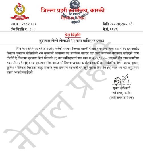 कास्की । पोखरा महानगरपालिका–१७ ढ्यामसाइडस्थित एक घरमा जुवा खेल्दै गरेका ११ जनालाई प्रहरीले पक्राउ गरेको छ।