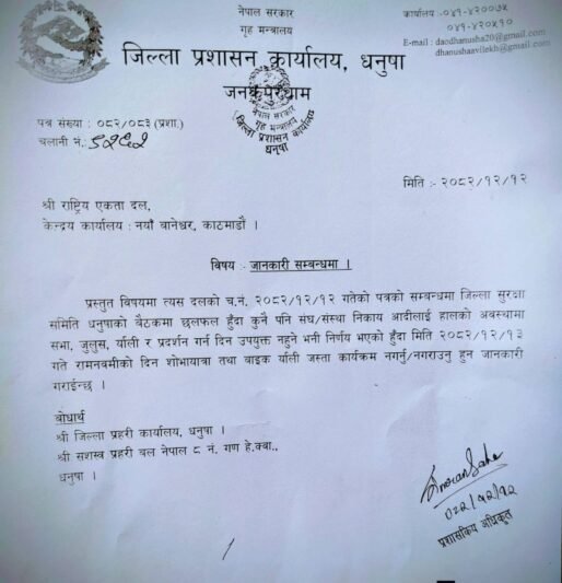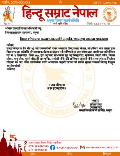 उनीहरुले प्रशासनसँग शान्ति सुरक्षाका लागि अनुमति पनि मागेका छन् । तर जिल्ला प्रशासन कार्यालय धनुषाले पत्र जारी गर्दै हिन्दूवादी संघ संस्थालाई कुनै पनि किसिमको सभा, जुलुस, र्याली र प्रदर्शन नर्गन आदेश दिएको छ । जिल्ला प्रशासन कार्यालयको पत्र पछि हिन्दूवादी संघ संस्थाहरुले आपत्ति जनाउँदै धार्मिक कार्यमा रोक लगाउन नहुने भन्दै कुनै पनि हालतमा मोटरसाइकल र्याली निकाल्ने बताएका छन् ।