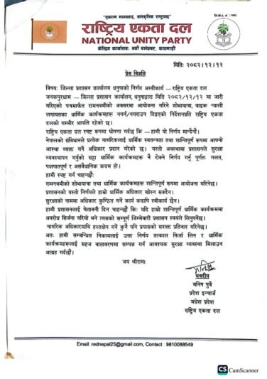 राष्ट्रिय एकता दलका मधेश प्रदेश इन्चार्ज मनिष पुर्वेले प्रेस विज्ञप्ति जारी गर्दै प्रशासनको निर्णय अस्वीकार्य रहेको बताएका छन् । उनले धार्मिक कार्यक्रममा रोक लगाउने निर्णय पूर्णतः गलत, पक्षपातपूर्ण र असंवैधानिक कदम रहेको विज्ञप्तिमा उल्लेख गरेका छन् । उनले प्रशासनको निर्णय नमान्ने र मोटरसाइकल र्याली तथा शोभा यात्रा निकाल्ने जानकारी गराएका छन् । कुनै किसिमको अवरोध सिर्जना भएमा त्यसको सम्पूर्ण जिम्मेवारी प्रशासनको हुने उनले चेतावनी दिएका छन् ।