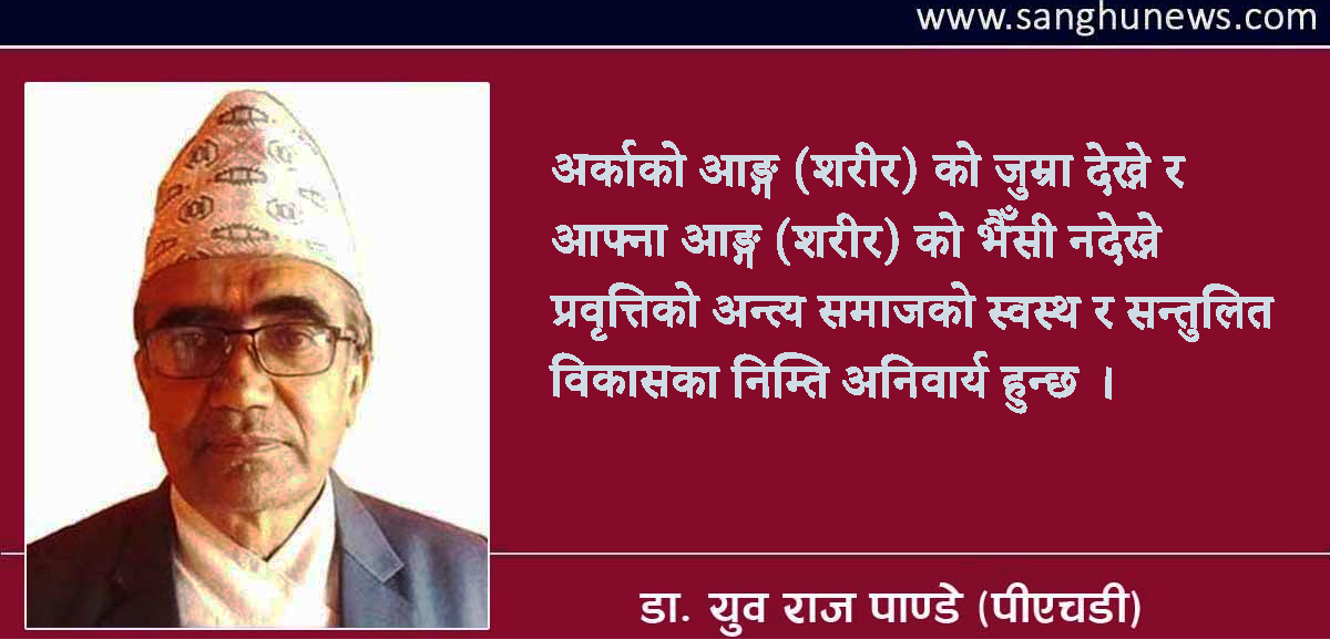 आफू र आफ्नाले जे गरे पनि गलत हुँदैन र अरूले जे गरे पनि त्यो गलत नै हुन्छ भन्ने खालको सोच र व्यवहार मुलुकको अग्रगतिको होइन, पश्चगतिको कारक हुन्छ भन्ने कुरा सबैले मनन गर्न जरुरी छ । मुलुकको विकासका निम्ति नेतृत्व मुलुकको हितप्रति वास्तविक रूपमा इमानदार हुनुपर्छ र सबैको सहयोग र सहकार्य गरेर अघि बढ्न समेत प्रतिबद्ध हुनुपर्छ ।
