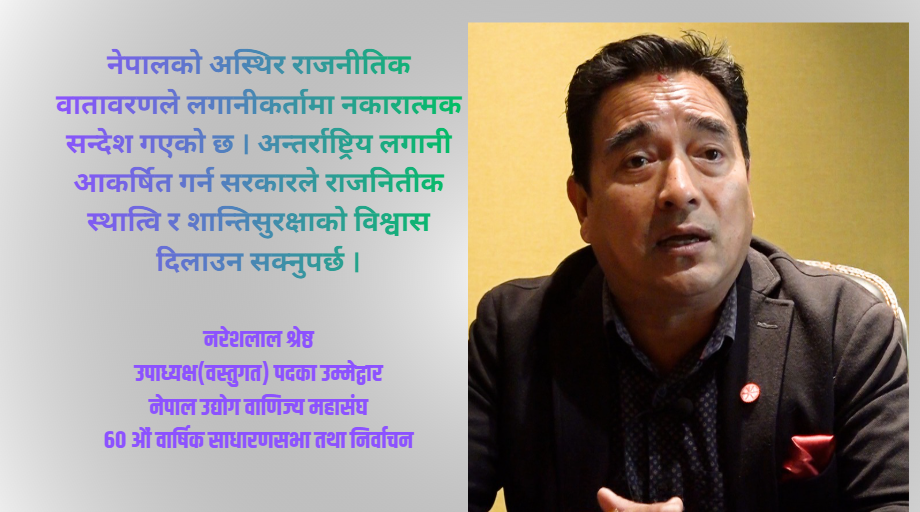 काठमाडौं । नेपाल उद्योग वाणिज्य महासंघको चैत २९ र ३० गते हुने ६० औं वार्षिक साधारणसभा तथा निर्वाचन नजिकिँदै गर्दा वस्तुगततर्फ उपाध्यक्ष पदका उम्मेदवार नरेशलाल श्रेष्ठले मुलुकमा रोजगारी सिर्जना, लगानीमैत्री वातावरण र नितीगत सुधार आफ्नो मुख्य उद्देश्य भएको बताएका छन् ।