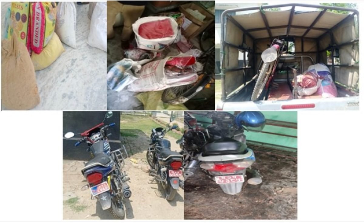 प्रहरीका अनुसार, बरामद सामानमा तरकारी, लेडिज कपडा, आलु, मिश्री, प्याज, मोटर साइकल थान २, स्कुटर थान १ र साईकल थान ३ गरि रु.४,३९,१००/-(चार लाख उनानचालिस हजार एकसय ) बराबरका सामान,मोटर साइकल, स्कुटर र साइकल सहित फेला पारेकाे छ ।
