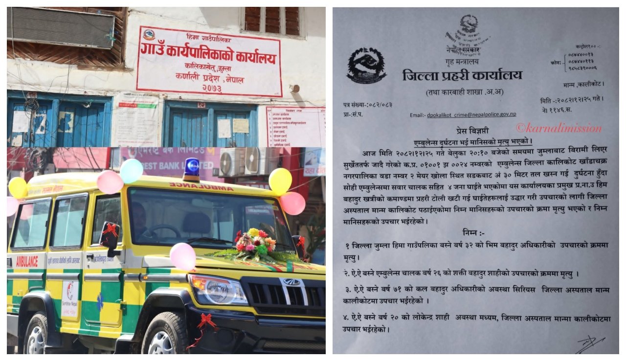 कालिकोट जिल्ला प्रहरीका अनुसार एम्बुलेन्स सडकदेखि २५ मिटर तल खसेको थियो । एम्बुलेन्सले हिमा-६ का ७१ वर्षीय बिरामी कलबहादुर अधिकारीलाई कर्णाली स्वास्थ्य विज्ञान प्रतिष्ठानबाट थप उपचारका लागि नेपालगन्ज लगिएको थियो ।