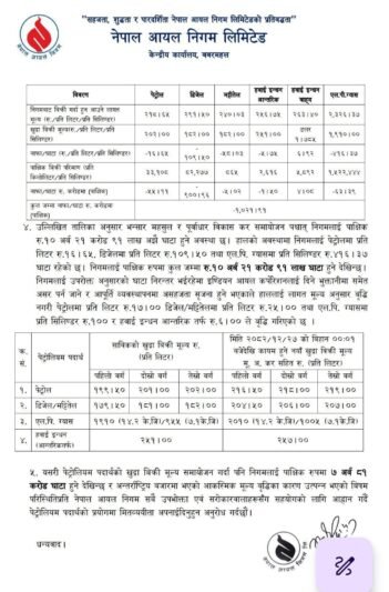 निगमले २०८२ चैत २७ गते आज १२ः०० बजेदेखि लागू हुनेगरी पेट्रोल, डिजेल, मट्टितेल, खाना पकाउने एलपी ग्यास र हवाई इन्धनको मूल्य बढाएको हो । निगम सञ्चालक समितिको बैठकले पेट्रोलमा प्रतिलिटर रु १७ र डिजेल र मट्टितेलमा प्रतिलिटर रु २५–२५ का दरले मूल्यवृद्धि गरेको हो ।