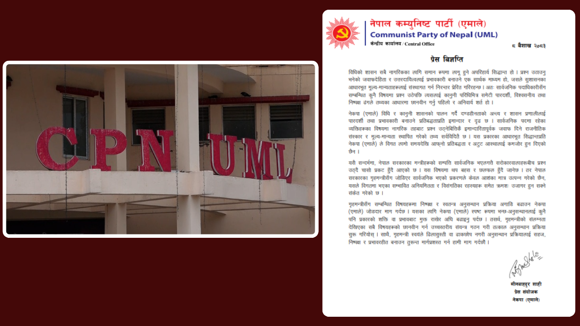 ‘गृहमन्त्रीसँग सम्बन्धित विषयहरुमा निष्पक्ष र स्वतन्त्र अनुसन्धान प्रक्रिया अगाडि बढाउन नेकपा एमाले जोडदार माग गर्दछ । यसका लागि अनुसन्धानलाई कुनै पनि प्रकारको शक्ति वा प्रभावबाट मुक्त राखेर अघि बढाइनु पर्दछ ’ विज्ञप्तिमा भनिएको छ ‘गृहमन्त्रीको संलग्नता देखिएका सबै विषयहरुको छानविन गर्न उच्च स्तरीय संयन्त्र गठन गरी तत्काल अनुसन्धान प्रक्रिया सुरु गरियोस ।’