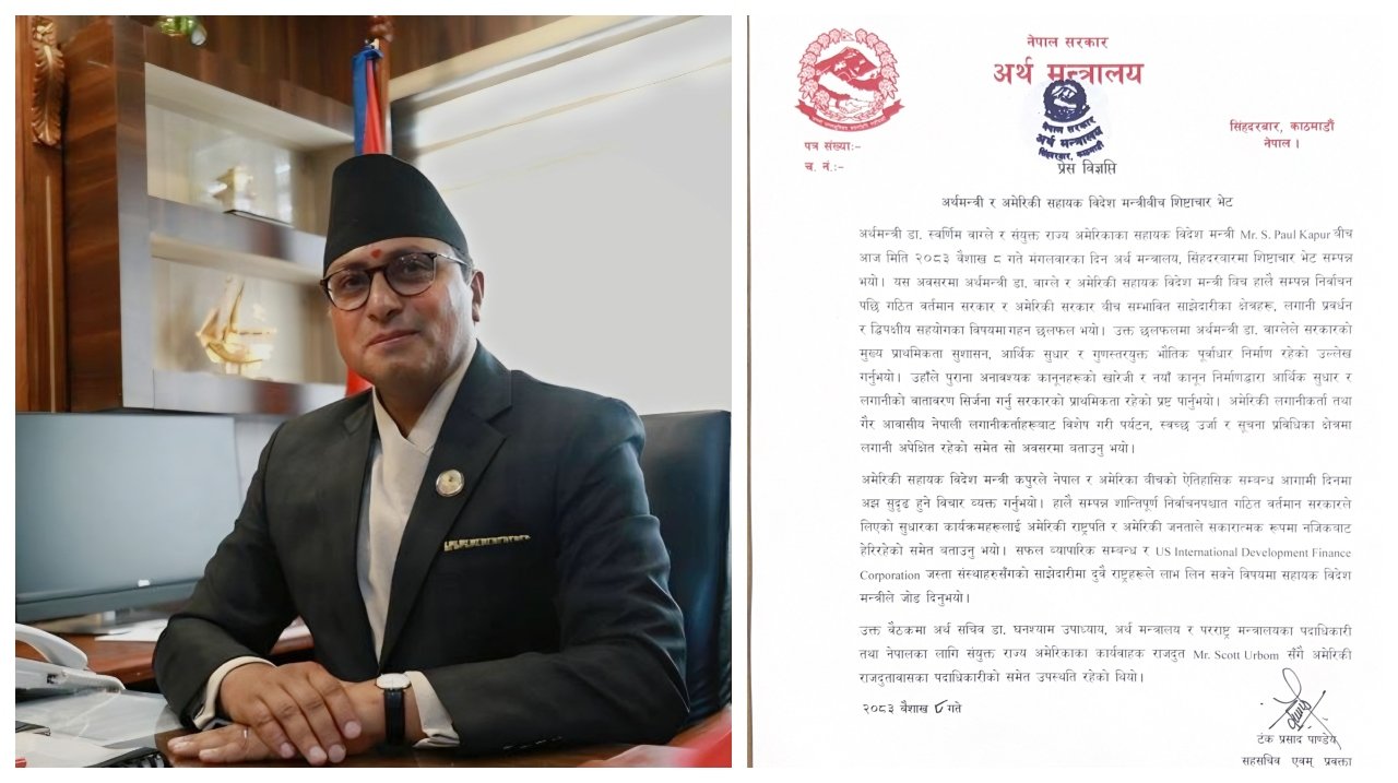 काठमाडौँ, ८ वैशाख : अर्थमन्त्री डा स्वर्णिम वाग्लेसँग संयुक्त राज्य अमेरिकाका सहायक विदेशमन्त्री एसपल कुपरले शिष्टाचार भेटवार्ता गर्नुभएको छ ।