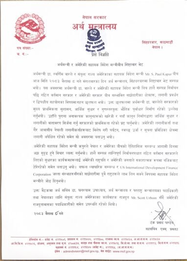 उक्त बैठकमा अर्थ सचिव डा घनश्याम उपाध्याय, अर्थ मन्त्रालय र परराष्ट्र मन्त्रालयका पदाधिकारी तथा नेपालका लागि अमेरिकाका कार्यवाहक राजदुत स्कोट अर्बोमसँगै अमेरिकी राजदूतावासका पदाधिकारीको उपस्थति रहेको थियो । —