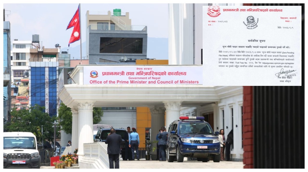 प्रधानमन्त्री तथा मन्त्रिपरिषद्को कार्यालयले बुधबार एक सूचना जारी गदै ‘शून्य बाँकी फाइल सप्ताह’ अभियानका क्रममा फछ्यौट हुन नसकेका फाइलबारे गुनासो गर्न सर्वसाधारणलाई आह्वान गरेको हो ।