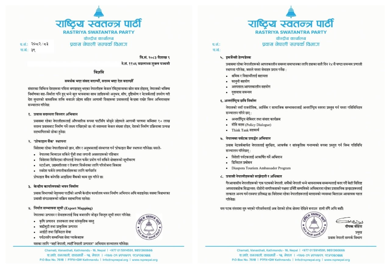 काठमाडौं । राष्ट्रिय स्वतन्त्र पार्टी (रास्वपा)ले विभिन्न देशमा रहेका नेपालीलाई रेमिट्यान्सको स्रोतमा मात्र सीमित नभइ राष्ट्र निर्माणमा सहनिर्माताका रूपमा स्थापित गर्ने उद्देश्यसहित विभिन्न कार्यक्रम सार्वजनिक गरेको छ ।