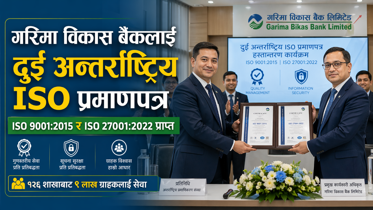 काठमाडौं । गरिमा विकास बैंक लिमिटेडले गुणस्तरीय बैंकिङ् सेवा र सूचना सुरक्षा व्यवस्थापनमा महत्वपूर्ण उपलब्धि हासिल गरेको छ। बैंकले गुणस्तरीय बैंकिङ् सेवा प्रवाह गरेबापत अन्तर्राष्ट्रिय मान्यता प्राप्त आईएसओ ९००१ः२०१५ र गुणस्तरीय सूचना सुरक्षा व्यवस्थापन गरेबापत आईएसओ २७००१ः२०२२ प्रमाणपत्र प्राप्त गरेको हो।