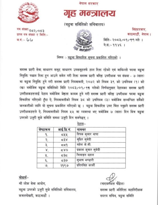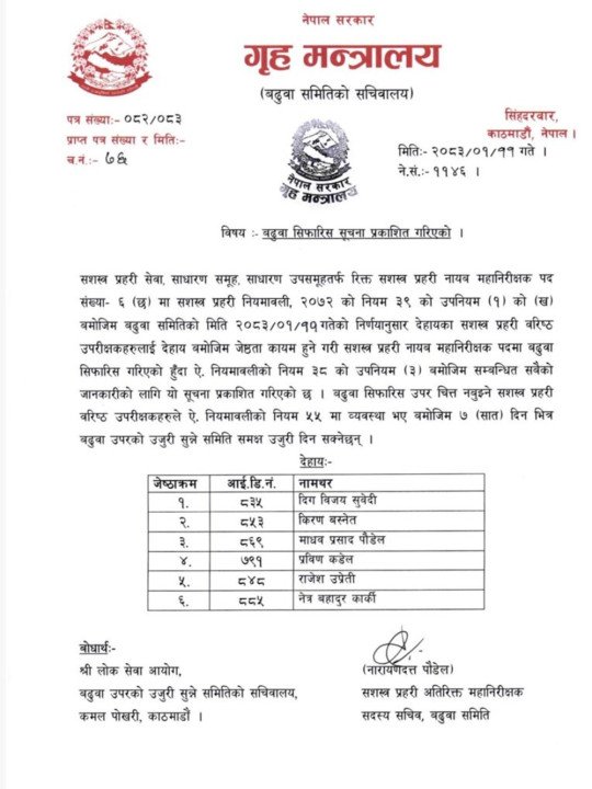 अब प्रश्न गृह मन्त्रालय र बढुवा समितिमाथि छ—यो सिफारिस नियम, मेरिट र संगठनहितका आधारमा गरिएको हो कि पहुँच र शक्ति–सन्तुलनको परिणाम ? यसको जवाफ कागजमा होइन, संगठनभित्रको मनोबल र आगामी निर्णयहरूले दिनेछन् ।