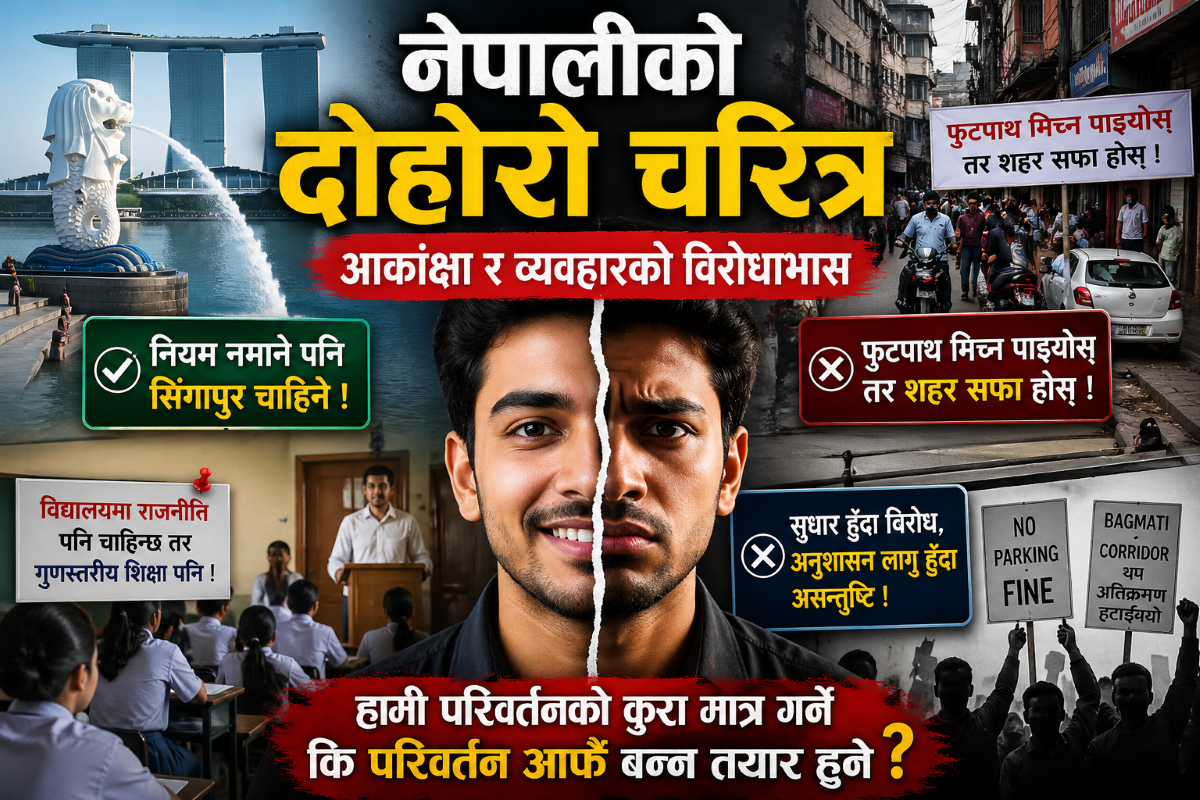 हालका सार्वजनिक अभिव्यक्तिहरूमा बालेन शाहले उठाउनुभएको “नेपालीको दोहोरो चरित्र” सम्बन्धी धारणा समकालीन नेपाली समाजको गहिरो आत्मसमीक्षा हो। “नियम नमाने पनि सिंगापुर चाहिने”, “फुटपाथ मिच्न पाइयोस् तर शहर सफा होस्”, “विद्यालयमा राजनीति पनि चाहिन्छ तर गुणस्तरीय शिक्षा पनि”, र “सुधार हुँदा विरोध, अनुशासन लागू हुँदा असन्तुष्टि” जस्ता भनाइहरूले नेपाली समाजको आकांक्षा र व्यवहारबीचको विरोधाभासलाई स्पष्ट रूपमा उजागर गरेका छन्।