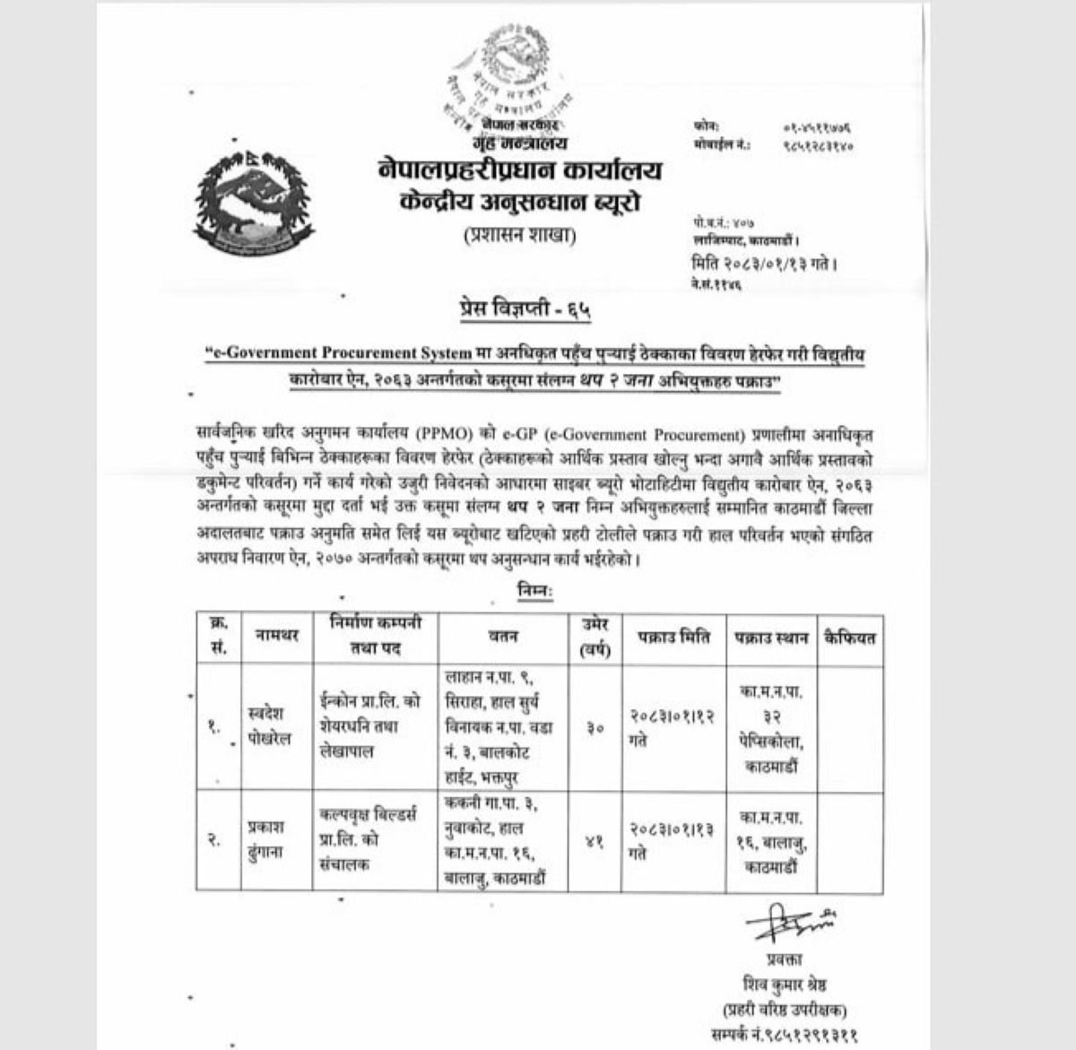 काठमाडौं । सार्वजनिक खरिद अनुगमन कार्यालयको e-Government Procurement System (e-GP) मा अनधिकृत पहुँच पुर्याएर ठेक्काको विवरण हेरफेर गरेको आरोपमा नेपाल प्रहरीकाे केन्द्रीय अनुसन्धान ब्यूरोले थप दुई जनालाई पक्राउ गरेको छ ।