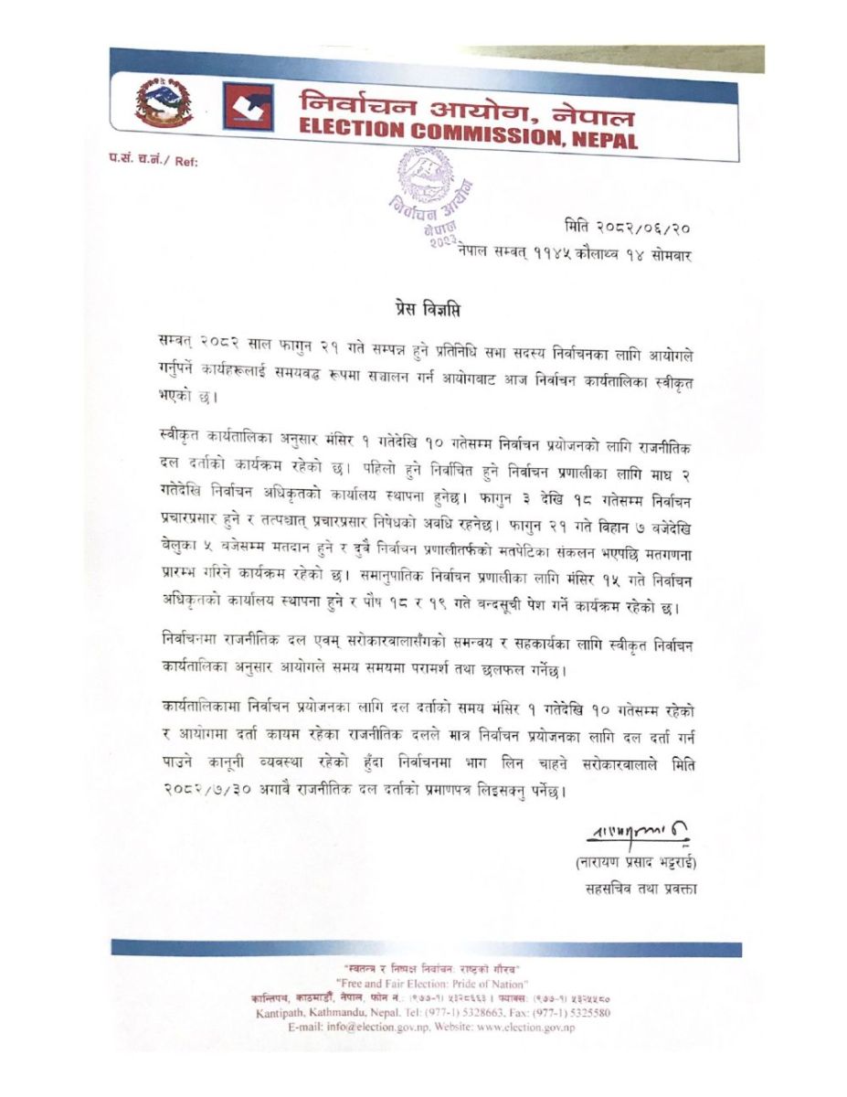 आयोगमा दर्ता कायम रहेका राजनीतिक दलले मात्र निर्वाचन प्रयोजनका लागि दल दर्ता गर्न पाउने कानूनी व्यवस्था रहेको हुँदा निर्वाचनमा भाग लिन चाहने सरोकारवालाले आगामी कात्तिक ३० गतेभित्र राजनीतिक दल दर्ताको प्रमाणपत्र लिइसक्नु पर्ने आयोगले जनाएको छ ।