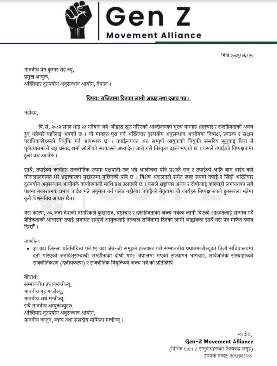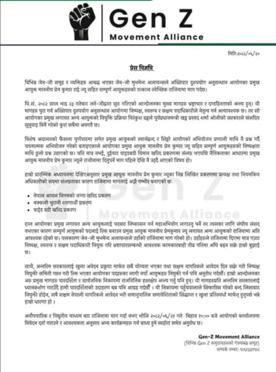 जेन–जेड मुभमेन्ट एलायन्सले अख्तियार प्रमुख प्रेमकुमार राईसहित सम्पूर्ण आयुक्तहरूको राजीनामा माग गर्दै देशव्यापी नागरिक दबाब अभियानको घोषणा गरेको छ।